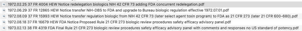 Hazel has been compiling the statutory, regulatory, institutional and budget history from the 1798 establishment of the Marine Hospital Service (precursor to the Public Health Service) through the 1902 Biologics Control Act and 1944 Public Health Service Act, to the 1972 alleged transfer and delegation of alleged biological product regulation authorities from Public Health Service, Secretary of Health, Education and Welfare (HEW, now HHS), National Institute of Health-Division of Biologics Standards, to the Food and Drug Administration-Bureau of Biologics.