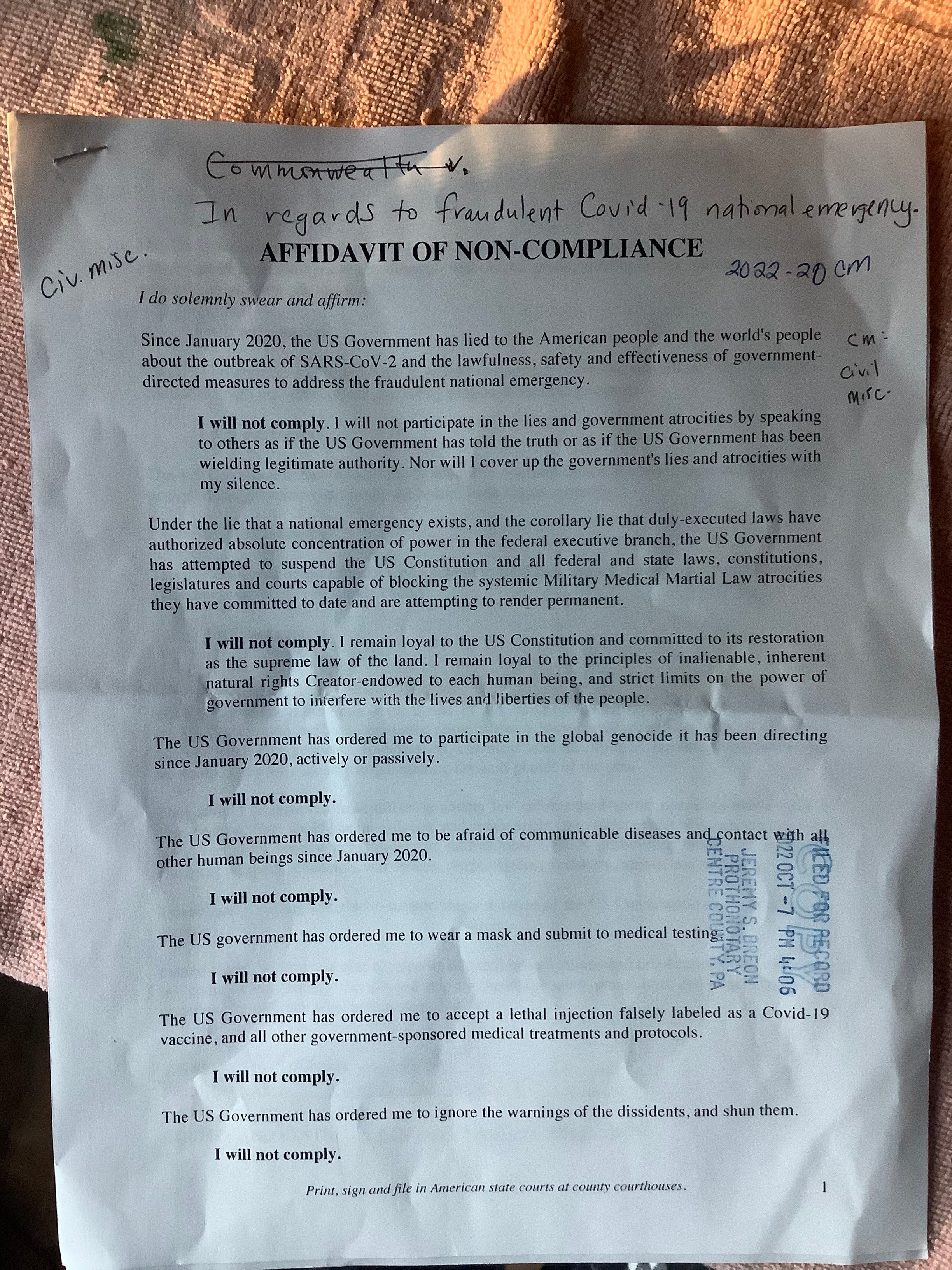 I explained that we understand the affidavit is an unusual filing, because there’s currently no active civil or criminal case in Centre County to prosecute the Covid-19 crime perpetrators, for which the affidavit would be a supporting document.