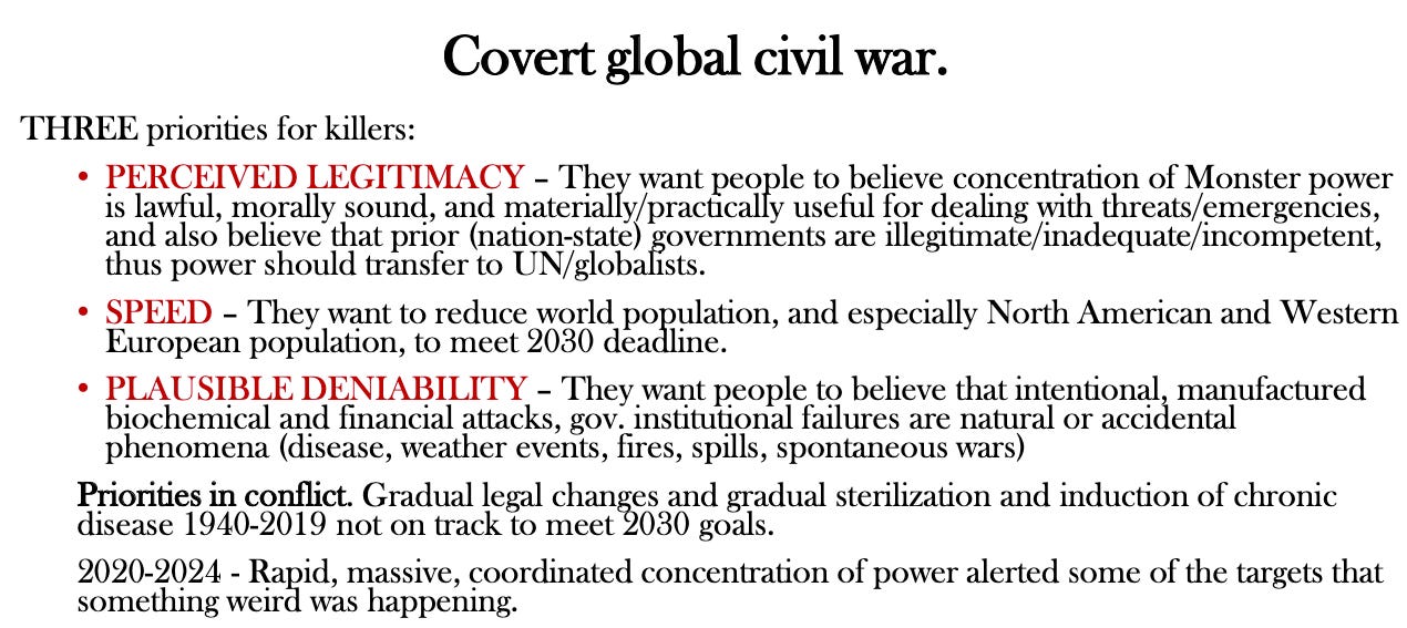 I’ve watched some parts of the Iceland recordings, and was interested to see that one of the segments cut from my presentation was about the globalists’ parallel goal (in addition to killing lots of people with legal impunity) — to destroy trust in national governments — and my view that citizens should not participate in that globalist project either. See Slide 9 in the slide deck.